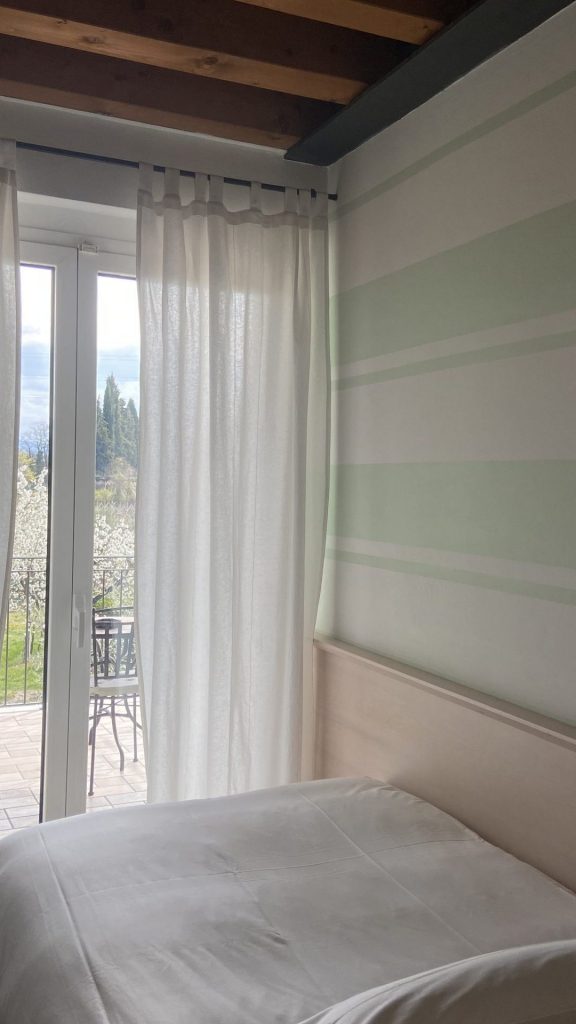 The single room follows the style of double rooms. Consisting of a full-size bed, desk and closet, it allows a stay in comfort even for those traveling alone. It features the same amenities as the neighboring rooms and a large terrace overlooking the vineyards of the Lake Garda hills.